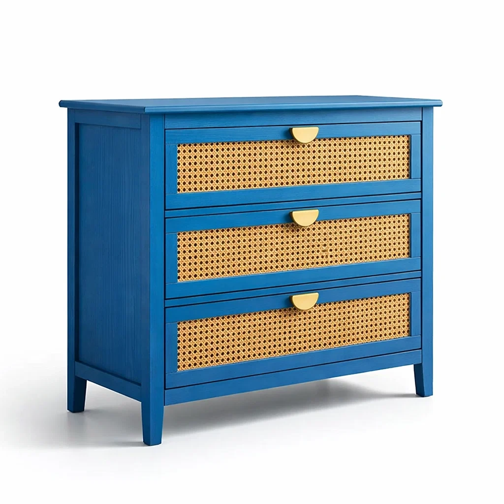 Commode en bois bleu avec 3 tiroirs et poignées dorées